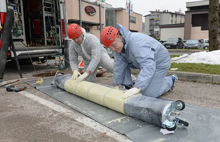 מחדירים את הפאקר לצנרת כאשר מולבש על הפאקר יריעת פיברגלס עם דבק סיליקט שמתקשח במהירות.
